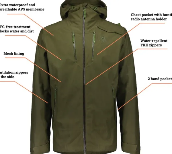 - Ympärivuotiseen käyttöön soveltuva kalvollinen metsästystakki