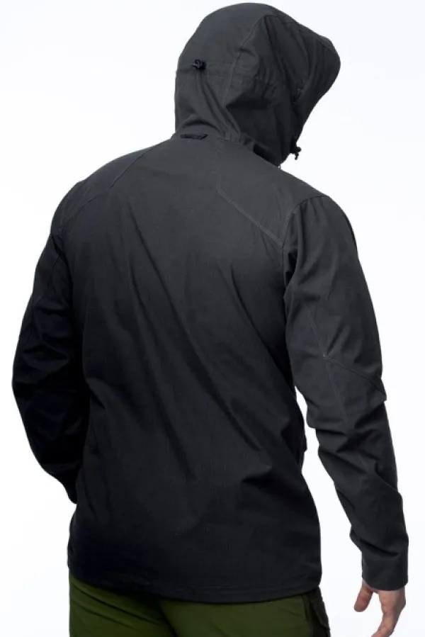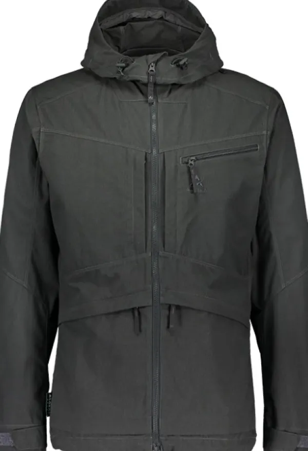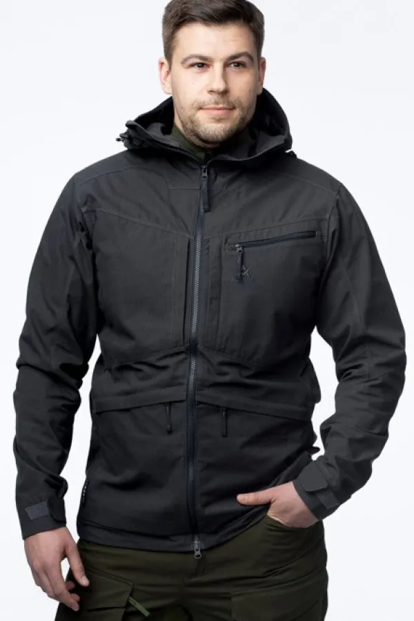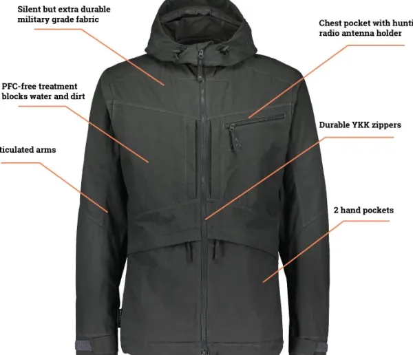 Kankaan PFC-vapaa, vettä ja likaa hylkivä DWR-käsittely pitää kantajan kuivana jopa kevyissä sadekuuroissa. Takissa on korkealla kauluksella varustettu, säädettävä huppu sekä käytännölliset taskut tavaroille ja metsästysradiolle. Takin leikkaus takaa erinomaisen liikkuvuuden.