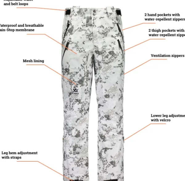 Housut ovat vedenpitävät ja hengittävät APS 2-layer-kalvon avulla. Housuissa on sivuilla tuuletusvetoketjut, joiden avulla säätelet helposti ilmanvaihtoa. Housut voidaan säätää vyötäröltä yksilöllisesti istuviksi ja lahkeensuiden säätömahdollisuuksien ansiosta saat ne napakasti kenkiin kiinni.