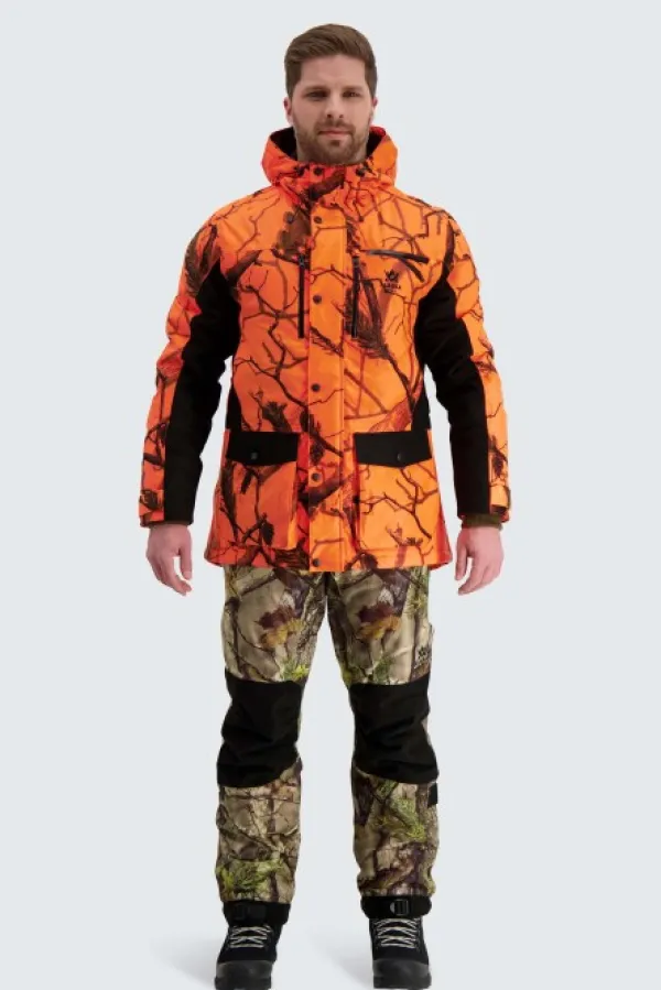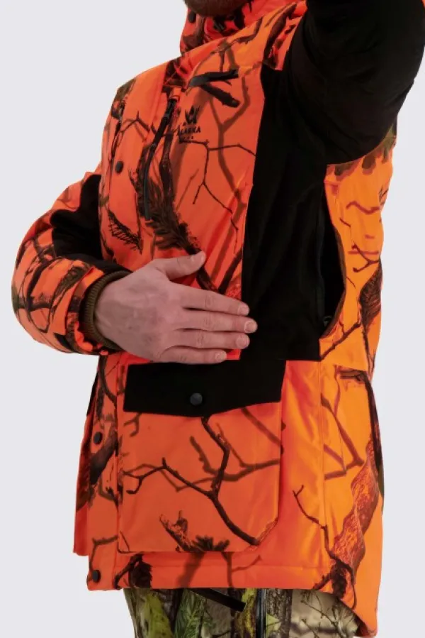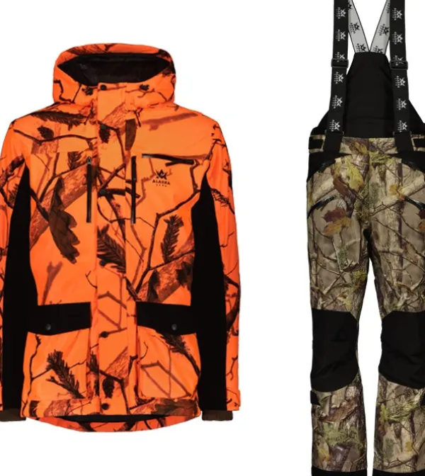 Alaska Tundra -metsästyspuku on varustettu vedenpitävällä ja hengittävällä Rain-Stop-kalvolla sekä lämpimällä SuperLoft-toppauksella. Takin pitkän mallin, housujen korkean selkäosan sekä henkseleiden ansiosta pukua on erittäin mukava käyttää. Sekä takissa että housuissa on ventilaatiovetoketjut hyvän ilmanvaihdon takaamiseksi. Taskut on suunniteltu erityisesti metsästäjän tarpeisiin. Harjattu, hiljainen pintamateriaali, vettähylkivät YKK-vetoketjut ja hyvät säätömahdollisuudet. Takin oranssi Blaze 3D -huomiocamokuvio on metsästysasetuksen mukainen ja sopii hirvijahtiin.