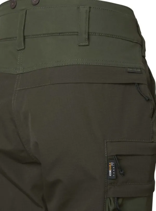 Chevalierin Cross Hybrid -metsästyshousut on valmistettu kestävästä ja joustavasta materiaalista. Housujen pakaraosissa ja polvissa on Ripstop Cordura® -vahvikkeet, ja sisäpuolella on osittain vedenpitävä, kosteutta kestävä kalvo. Kalvokankaassa on miellyttävän pehmeä harjattu pinta. Housuissa on hieman korotettu vyötärö, ja vyötärönauhassa on napit olkaimille. Lisäksi housuissa on kaksi etutaskua, takatasku sekä kaksi vetoketjullista reisitaskua. Toisen reisitaskun sisällä on vetoketjullinen turvatasku esimerkiksi avaimille. Cross Hybrid Pants -housuissa on ergonomisesti taivutetut lahkeet, ja kaksisuuntaiset vetoketjut sivuilla takaavat hyvän ilmanvaihdon. Lahkeensuissa olevilla koukuilla housut pysyvät napakasti kenkien päällä.