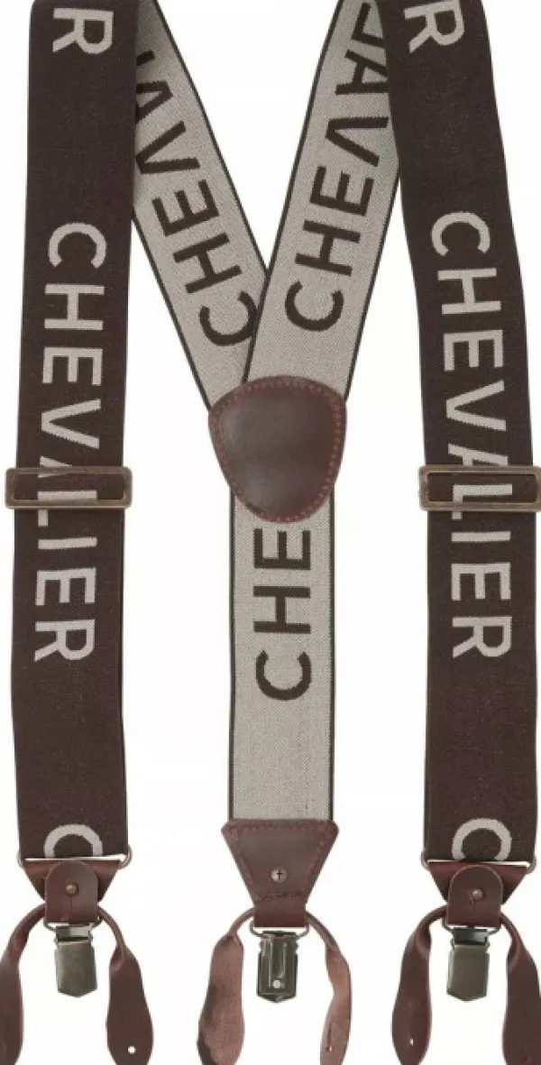 Leveät, säädettävät ja joustavat Chevalier Logo -henkselit. Leveistä henkseleistä löytyy sekä klipsi- että nappikiinnitys. Osana kestävän kehityksen työtä nahkaosat valmistetaan edellisen tuotannon jätteistä.