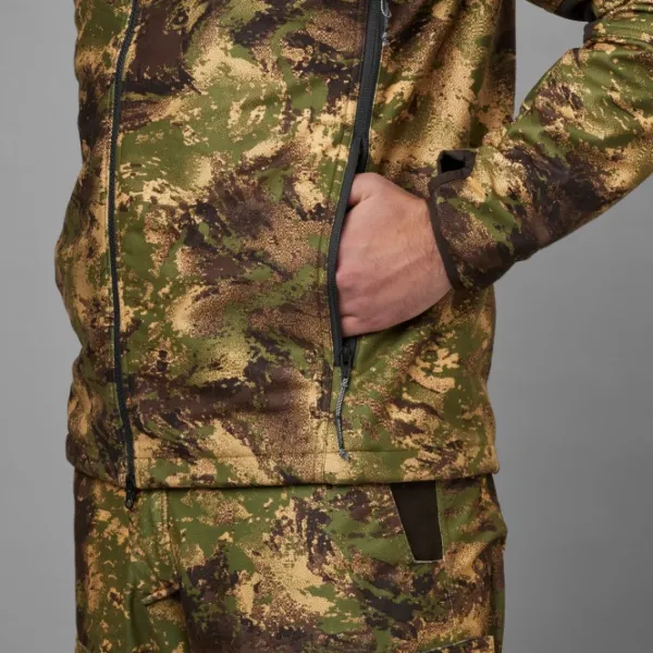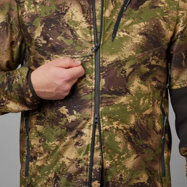Härkilän Deer Stalker Camo WSP fleecetakki on valmistettu pehmeästä, joustavasta ja hiljaisesta materiaalista. Takissa on Gore-Tex Infinium™ -kalvo, joka eristää hyvin tuulisella säällä. Se on myös saanut DWR-käsittelyn, joka tekee siitä vettä ja likaa hylkivän. Korkea kaulus suojaa kaulaa säältä ja tuulelta ja jos takilla tulee liian kuuma, hihojen alla on vetoketjulliset tuuletusaukot.
