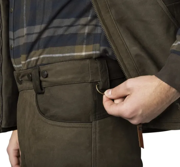 Kestävät nahkaiset housut metsästykseen, joissa on erittäin pitävä vyötärönauha, henkselinapit, patruunatasku ja tuuletusvetoketjut.