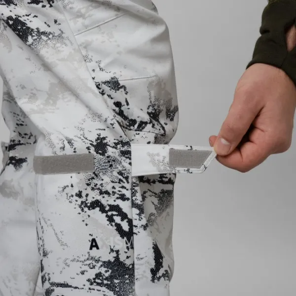 Housut on naamioitu Härkilän omalla AXIS MSP Snow® -naamiolla, joka on jatkokehitys heidän suositusta AXIS MSP® -naamiosta. Aktiivisen talvimetsästyksen aikana on erityisen tärkeää, että pystyt haihduttamaan mahdollisimman paljon kosteutta kehosta. Härkila on ottanut tämän huomioon. Sen lisäksi, että housut hylkivät kosteutta, hengittävät hyvin ja niissä on sisäinen verkkovuori, joka tarjoaa paremman ilmankierron, niissä on pitkät tuuletusaukot vetoketjulla reisien takana. Tuuletusaukot on varustettu verkkovuorauksella, jotta housuihin ei pääse lunta niiden ollessa auki. Lisäksi housut on saanut likaa ja vettä hylkivän DWR-käsittelyn.