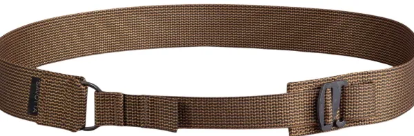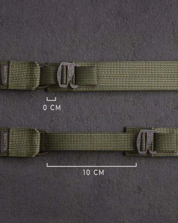 Säädöt tehdään teräksisellä G-koukulla. Ylimääräinen 25 mm:n hihnan pituus voidaan helposti kätkeä vyön taakse D-renkaan avulla.
