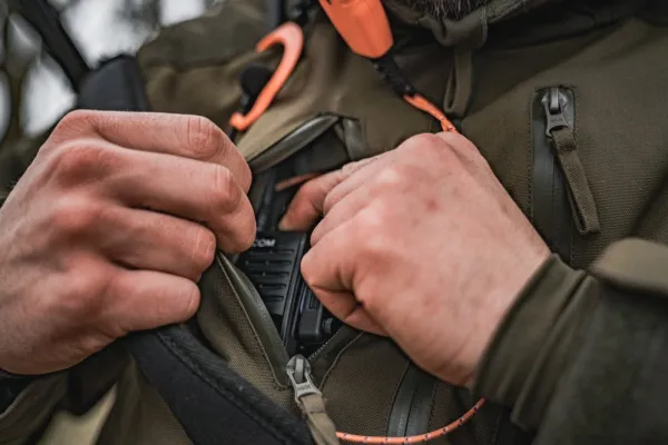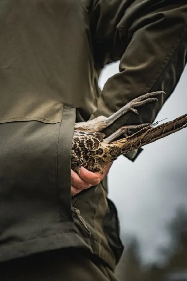 Vedenpitävä takki on varustettu irrotettavalla ja säädettävällä hupulla, vedenkestävillä taskuilla ja riistavarastolla – täydellinen ajometsästykseen. Takissa on myös kosteusvaikutuksia estävä vuori ja säädettävä helma, joka takaa mukavuuden ja kestävyuden.