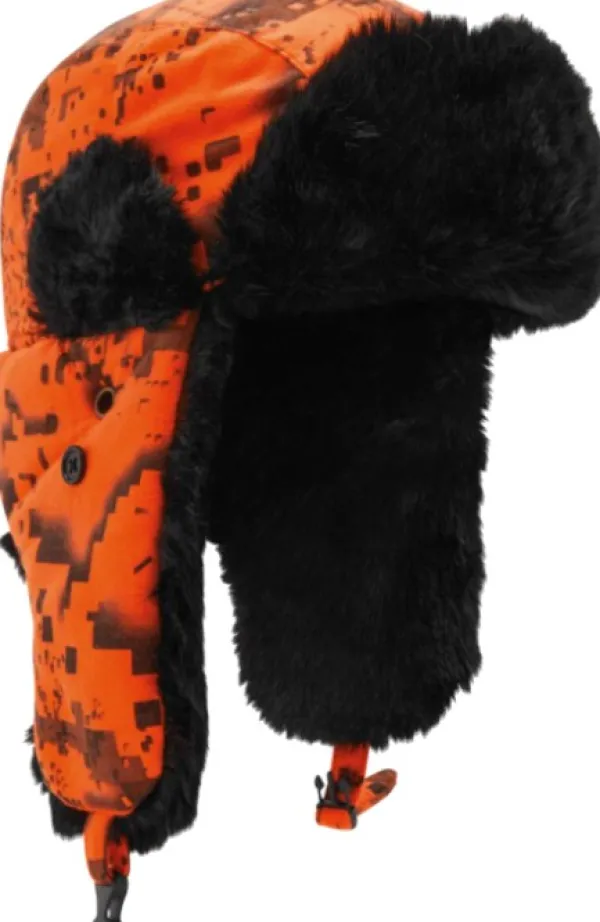 Lämmin karvalakki, joka on vuorattu sisältä pehmeällä ja lämpimällä keinoturkiksella. Ulkopuoli oranssissa Desolve Fire -turvacamokuosissa. Läpissä kiinnityshihna, jolla läpät saa liitettyä yhteen leuan alla tai päälaella, jos haluaa läppien pysyvän ylhäällä. Materiaali kauttaaltaan polyesteriä.