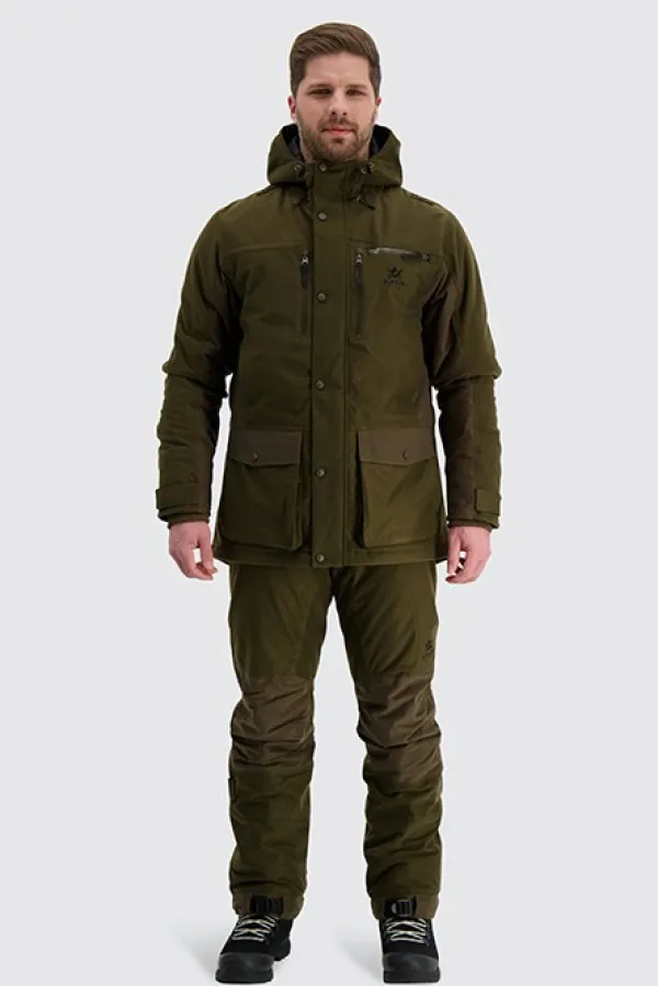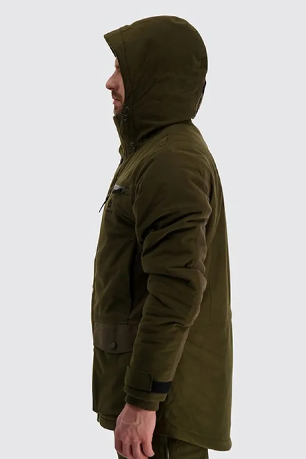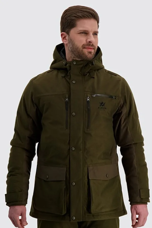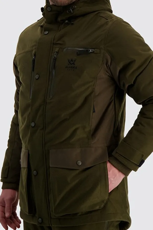 Vedenpitävällä ja hengittävällä Rain-Stop-kalvolla varustetussa Alaska Tundra -metsästystakissa on lämmin SuperLoft-toppaus. Takin pitkä malli lisää käyttömukavuutta kylmillä keleillä. Takissa on harjattu, hiljainen pintamateriaali, vetoketjulliset rintataskut, kaksi suurta, läpällistä alataskua sekä kaksi sisätaskua. Huppua ja hihansuita voi säätää, ja molemmissa kyljissä on ventilaatiovetoketjut. Lisäksi takissa on vettähylkivät, kestävät YKK-vetoketjut.