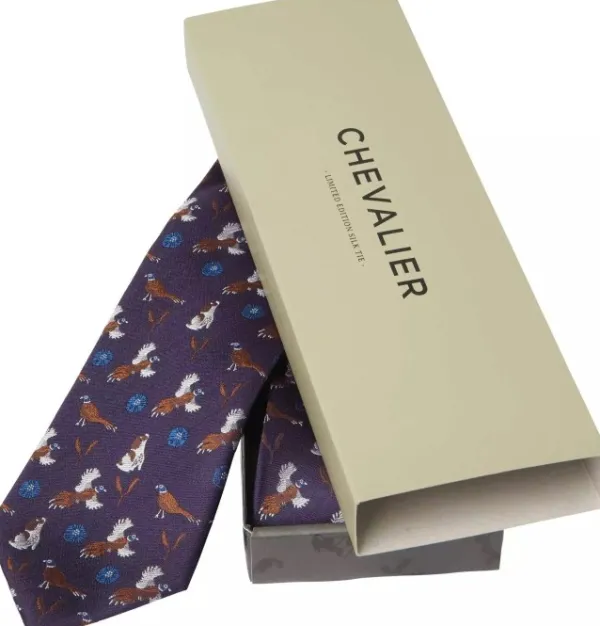Chevalier Spaniel on tyylikäs, jakardikudottu silkkisolmio, jossa on metsästysaiheinen kuviointi. Solmio toimitetaan kauniissa lahjapakkauksessa.