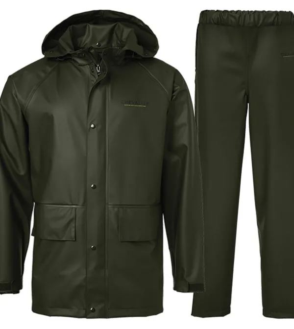 Chevalierin väljähkö sadepuku, joka on helppo pukea muiden vaatekertojen päälle sateen yllättäessä. Housuissa joustava vyötärö, ja takissa säädettävä huppu, läpälliset taskut sekä säädettävät hihansuut. Takki sulkeutuu vetoketjulla.